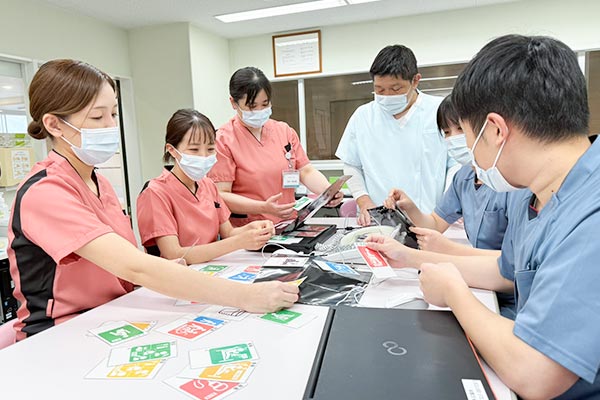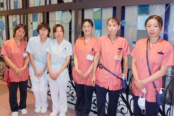 私たちの療養病棟には、急性期の治療を受け、病状が安定した患者さまが転入していらっしゃいます。看護スタッフは、ベテランから新人まで個性豊かな人が揃っています。各々の感性を活かしながら、より良いケアができるように日々考え、意見を出し合って仕事に励んでいます。また、リハビリスタッフやソーシャルワーカー、院外の関連職種の方々とも協力して、自宅へ帰られる患者さまや施設に入所される患者さま、そしてご家族の皆さまそれぞれが安心して退院を迎えられるように全力で取り組んでいます。