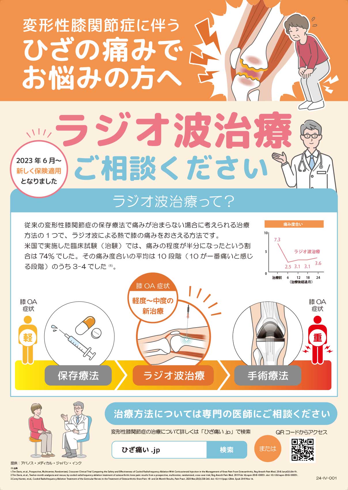 当院では、令和8年度より変形性膝関節症の新しい治療法、クーリーフ(末梢神経ラジオ波焼灼療法)を開始します。クーリーフ(末梢神経ラジオ波焼灼療法)は膝の痛みを軽減する新しい治療方法で、2023年6月に健康保険が適用となりました。